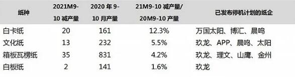 隨著能耗雙控政策加碼,“限電”備受關注。用電大戶造紙企業(yè)也受到影響。 那么,本次能耗雙控加碼會在多大程度上影響造紙企業(yè)產能?這些影響將持續(xù)多長時間? 產能受限 8月12日,國家發(fā)展改革委印發(fā)了《2021年上半年各地區(qū)能耗雙控目標完成情況晴雨表》,在能源消費總量控制方面,仍有8個省(區(qū))為一級預警(形勢十分嚴峻)。所謂能耗雙控最早是2015年提出,旨在按省、自治區(qū)、直轄市行政區(qū)域設定能源消費總量和強度控制目標,對各級地方政府進行監(jiān)督考核。從目前的情況看,諸如廣東、廣西、福建和江蘇等造紙大省,都進入了能耗雙控“雙紅線”區(qū)域。 針對上述情況,不少省市已經出臺了應對措施。例如,廣東自今年5月就開始實行“開五停二”有序用電。江蘇則是從9月15日起,部分地區(qū)實施限電,時間暫定為15天。廣西要求區(qū)域內的電解鋁企業(yè)自9月開始月度用電負荷在1-6月的平均月度用電負荷的基礎上全時段壓減35%。而玖龍紙業(yè)、理文造紙以及山鷹紙業(yè)等均有多家位于廣東、福建的工廠發(fā)布停機函。 根據東吳證券統計,2021 年 9 月以來,包括玖龍紙業(yè)、理文造紙、山鷹紙業(yè)、太陽紙業(yè)、晨鳴紙業(yè)、APP、博匯紙業(yè)等龍頭紙企在內的多家紙企已發(fā)布停機函。根據已披露的停機函統計,9-10 月各紙種減產量達到70萬噸,其中白卡紙、文化紙(包括雙銅紙和雙膠紙)、箱板瓦楞紙、白板紙減產量分別約為20、13、35、2萬噸,占2020年9-10月該紙種產量的比例分別為12.3%、5.5%、4.2%、1.6%。