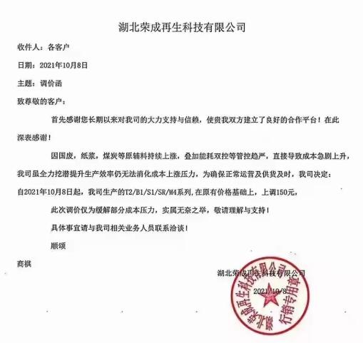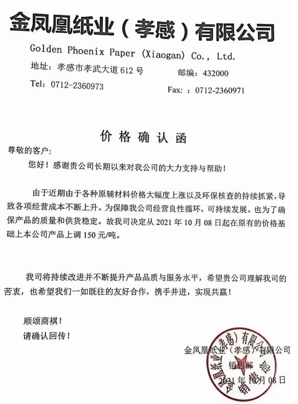 金鳳凰紙業(孝感)有限公司也發布價格確認函表示,由于近期各種原輔材料價格大幅度上漲以及環保核查的持續抓緊,導致各項經營成本不斷上升。為保障公司經營良性循環,可持續發展,也為了確保產品的質量和供貨穩定,故公司決定從2021年10月08日起在原有的價格基礎上本公司產品上調150元/噸。