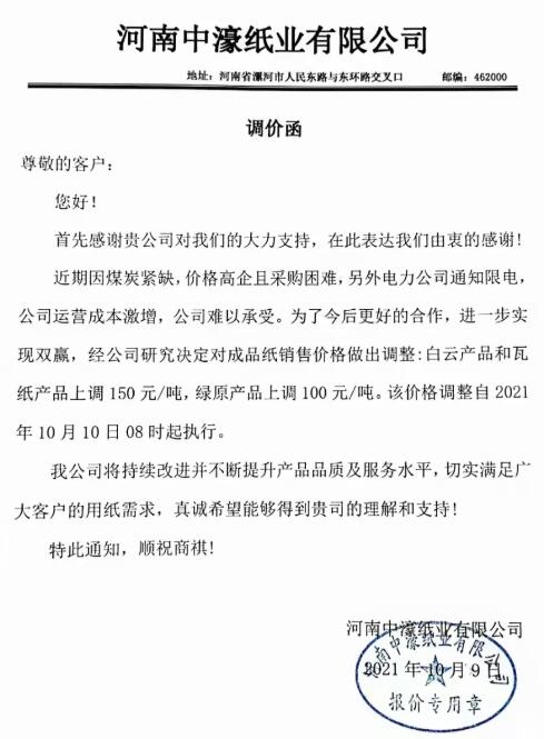 河南中濠紙業有限公司調價函稱,近期因煤炭緊缺,價格高企且采購困難,另外電力公司通知限電,公司運營成本激增,公司難以承受。為了今后更好的合作,進一步實現雙贏,經公司研究決定對成品紙銷售價格做出調整:白云產品和瓦紙產品上調150元/噸,綠原產品上調100元/噸。該價格調整自2021年10月10日08時起執行。