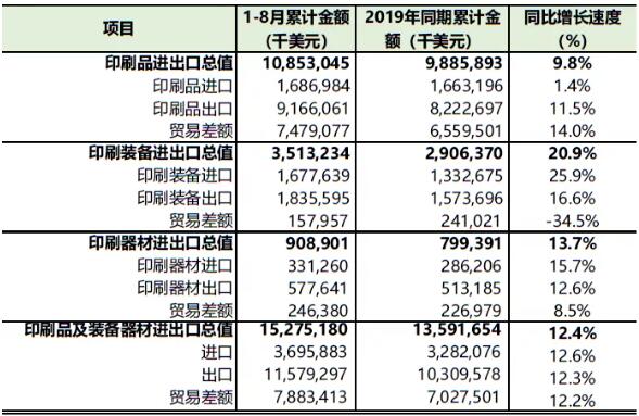 同期,國內印刷器材進出口貿易順差2.46億美元(同比增長69.5%)。 本期觀察 總結: 2021年1-8月國內印刷產業相關商品進出口總值持續保持增長。與去年同期相比,本期國內印刷品、印刷裝備、印刷器材的進出口規模均已超過去年同期水平。其中,印刷裝備表現尤為突出(同比增長50.3%),而印刷器材也表現不俗(同比增長31.6%),印刷品則表現相對平緩(同比增長6.9%)。 本期國內印刷品、印刷裝備、印刷器材進口、出口增長較快的前五位商品類別如下: 進口:其他出版物印刷品(+282.2%)、凸版印刷機(+242.5%)、CTP膠印版材(+224.9%)、其他紙質包裝容器(+97.1%)、印刷輔機和零件(+85.1%); 出口:票證類印刷品(+180.9%)、凹印機(+77.1%)、印刷輔機和零件(+73.8%)、絲印機(+63.0%)、水性噴墨墨水(+60.2%)。 本期,國內印刷品、印刷裝備、印刷器材進出口相對萎縮的商品類別如下: 進口:期刊雜志類印刷品(-81.2%)、柔版印刷機(-38.4%); 出口:其他商業類印刷品(-36.5%)、辦公類印刷品(-5.5%)。 如果說2020年同期國內印刷產業正處于遭受疫情沖擊后的復工復產期,相關商品的進出口處于低谷,用今年的數據與之對比會有較大的差距(詳見表8),那么,本期數據與新冠肺炎疫情暴發前的數據(2019年1-8月)相比又會如何呢? 印刷品進口增長1.4%,出口增長11.5%; 印刷裝備進口增長25.9%,出口增長16.6%; 印刷器材進口增長15.6%,出口增長12.6%。 上述對比數據表明,截至2021年8月,國內印刷產業相關商品的進出口貿易規模已經全面恢復到了疫前水平,而且多數商品的進出口規模還有了一定幅度的增長。 表8 2021/2019年1-8月國內國內印刷品及印刷裝備器材進出口對比