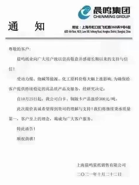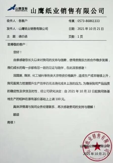 隨著原材料成本、用電成本、能源成本急速上漲,二級紙板廠也頂不住了!從10月20日開始陸續傳出漲價函。持續不斷的漲價,如果從9月開始算,已經整整6輪。