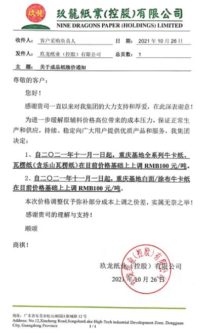 10月26日龍頭企業玖龍紙業(控股)有限公司連發6張漲價函,通知其旗下6大生產基地全系列牛卡紙、瓦楞紙、白面/涂布牛卡紙在原有基礎上上漲100-150元/噸。其中漲幅最大的是太倉基地,統一上調150元/噸,其他基地均上調100元/噸。
