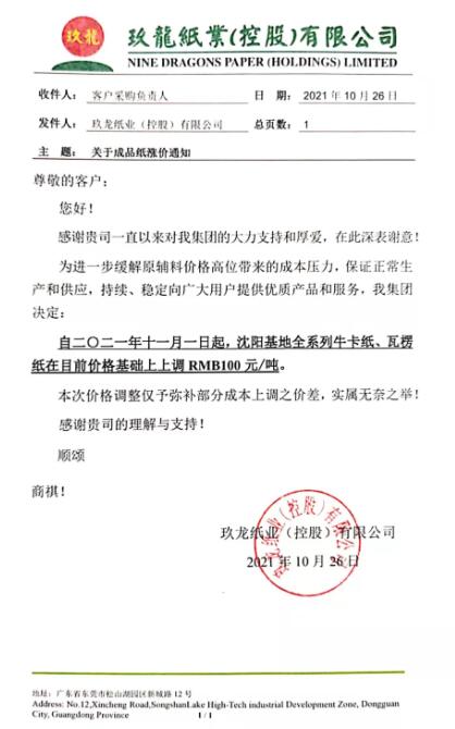 沈陽玖龍:11月1日起,全系列牛卡紙、瓦楞紙漲價100元/噸。