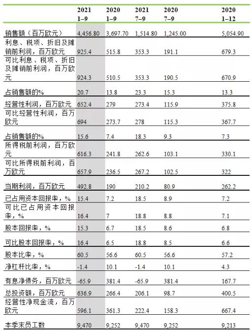 2021年1月-9月(與2020年同期相比) 銷售額為44.57億歐元(去年同期:36.98億歐元)。 經營性利潤為6.52億歐元(去年同期:2.79億歐元)。可比經營性利潤為6.94億歐元(去年同期:2.74億歐元)。 稅前利潤為6.16億歐元(去年同期:2.42億歐元)。可比稅前利潤為6.58億歐元(去年同期:2.36億歐元)。 可比已占用資本回報率為16.4%(去年同期:7.0%)。 經營性凈現金流為5.96億歐元(去年同期:3.61億歐元)。 2021年7月-9月(與2020年同期相比) 銷售額為15.15億歐元(去年同期:12.45億歐元)。 經營性利潤為2.73億歐元(去年同期:1.16億歐元)。可比經營性利潤為2.78億歐元(去年同期:1.15億歐元)。 稅前利潤為2.63億歐元(去年同期:1.03億歐元)。可比稅前利潤為2.67億歐元(去年同期:1.02億歐元)。 可比已占用資本回報率為18.8%(去年同期:8.8%)。 經營性凈現金流為2.22億歐元(去年同期:1.58億歐元)。 2021年第三季度主要事件 與上個季度相比,長纖漿和短纖漿以美元計算的市場均價相對穩定,而與去年的第三季度相比,市場均價顯著上漲。 所有的主要市場對芬林紙板產品的需求依然旺盛,平均價格大幅上漲。 芬林紙板決定投資2.1億歐元,以提高其位于瑞典的胡蘇姆木漿廠的折疊紙板產能。