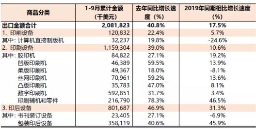 相關印刷品主要子項出口,字典書籍類印刷品8.47億美元(同比增長27.4%、比2019年同期下降3.0%)、期刊雜志類印刷品565.6萬美元(同比增長31.1%、比2019年同期下降25.9%)、兒童圖畫書類印刷品5.88億美元(同比增長21.4%、比2019年同期增長17.0%)、瓦楞紙盒(箱)13.83億美元(同比增長31.7%、比2019年同期增長54.8%)、非瓦楞紙折疊紙盒15.95億美元(同比增長42.0%、比2019年同期增長50.3%)、紙袋12.18億美元(同比增長37.2%、比2019年同期增長11.6%)、辦公類印刷品23.01億美元(同比下降5.0%、比2019年同期下降15.2%)、票證類印刷品8294.5萬美元(同比增長153.5%、比2019年同期增長12.7%)、其他商業印刷品16.63億美元(同比下降31.6%、比2019年同期增長10.2%)。 同期,國內印刷品進出口貿易順差86.70億美元(同比增長8.9%、比2019年同期增長15.9%)。 國內印刷裝備進出口概況 2021年1-9月國內印刷裝備進口19.11億美元(參見表4),與去年同期相比增長53.8%、比2019年同期增長28.2%。其中,印前設備進口0.46億美元(同比增長21.4%、比2019年同期增長4.3%)、印刷設備進口16.76億美元(同比增長56.0%、比2019年同期增長27.4%)、印后設備進口1.90億美元(同比增長45.6%、比2019年同期增長43.6%)。 表4 2021年1-9月 國內印刷裝備進口統計