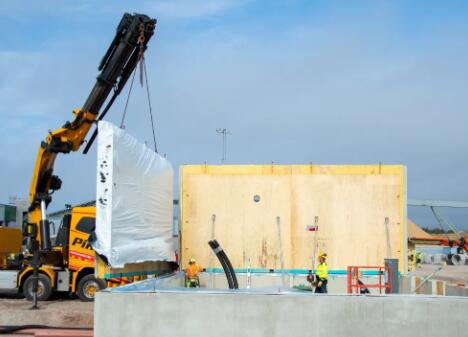Lipa-Betoni首席執(zhí)行官Satu Lipsanen說: “在攻克了最初的難關(guān)后,混合夾層墻構(gòu)件的生產(chǎn)如同混凝土夾層構(gòu)件一樣易如反掌。我們的合作伙伴擁有淵博的專業(yè)知識,在與他們的密切合作下,我們順利完成了墻體生產(chǎn)。” 在建筑工地順利安裝混合夾層構(gòu)件 在原木分揀大樓100平方米的地面層安裝混合夾層墻構(gòu)件僅花費(fèi)了5個小時。
