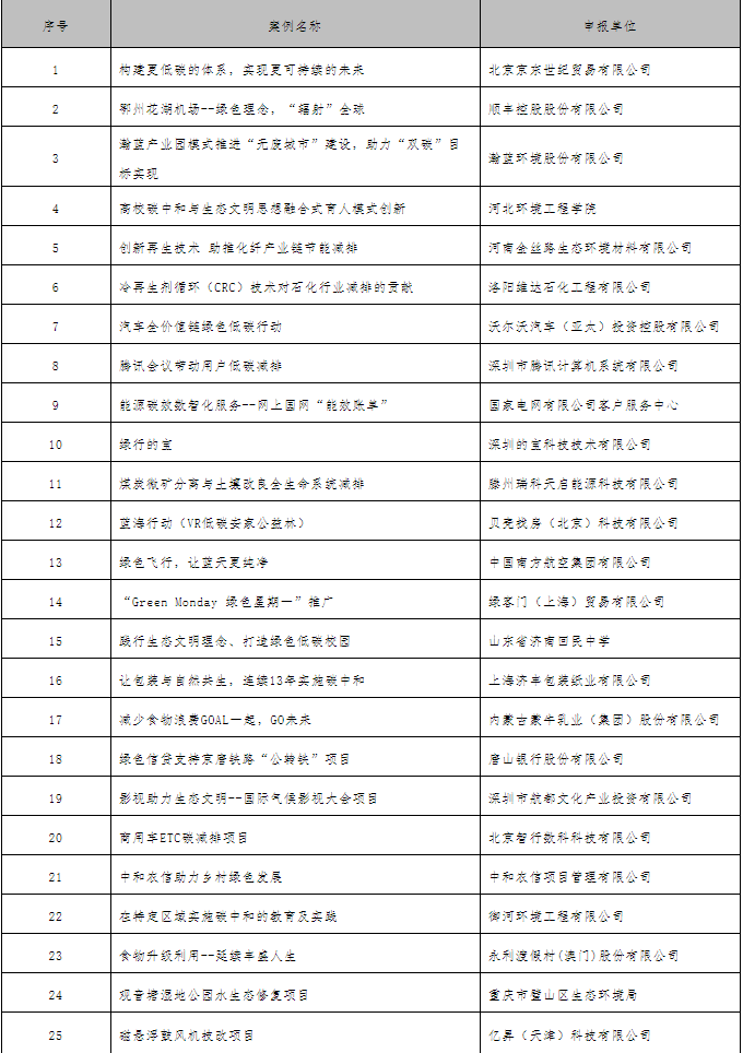 2021年5月31日,人民網(wǎng)、中華環(huán)保聯(lián)合會、生態(tài)環(huán)境部宣傳教育中心聯(lián)合啟動了第二屆綠色經(jīng)濟發(fā)展論壇2021年度“碳中和典型案例”征集評審活動。經(jīng)專家集體審議,并于10月13日至10月19日進行公示后,現(xiàn)已產(chǎn)生2021年度“碳中和典型案例”入選名單。 感謝社會各界對本次活動及碳減排等生態(tài)環(huán)境保護工作的大力支持! 特此通告。 附件:2021年度“碳中和典型案例” 人民網(wǎng)、中華環(huán)保聯(lián)合會、生態(tài)環(huán)境部宣傳教育中心 2021年11月19日 附件: 2021年度“碳中和典型案例” (排名不分先后)