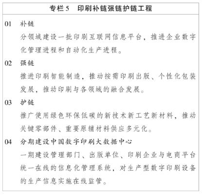 (三)分類布局建設裝備器材創新高地。加快重大技術裝備工程化產業化突破,支持浙江(溫州、杭州)、北京、上海、廣東(廣州、東莞)建設印刷機械制造創新基地,陜西(渭南、西安)建設包裝印刷機械制造創新中心,天津、深圳建設印后裝備制造創新中心,河南(南陽)建設綠色版材創新中心,江蘇(蘇州、泰州)建設綠色原輔材料創新中心。加強統籌規劃,建設完善印刷裝備技術創新信息交流平臺。 四、穩步提升產業鏈供應鏈現代化水平 堅持自主可控、技術先進、安全高效,推動全印刷產業鏈供應鏈優化升級,推進產業基礎高級化、產業鏈現代化。 (一)培育壯大龍頭骨干企業。實施國家印刷示范企業培育工程,增強要素保障能力,培育壯大具有生態主導力和核心競爭力的“鏈主”或龍頭企業,培育壯大細分領域單項冠軍企業。支持中小企業向“專精特新”方向發展,培育壯大中小特色競爭企業。支持優質企業上市。實施產業鏈供應鏈質量提升行動,提高標準化精細化信息化管理水平,推動企業創品牌、提品質,加快高端化智能化綠色化發展。 (二)建設先進產業集群。依托國家印刷示范企業、龍頭骨干企業、產業基地園區等優勢資源,在合理服務半徑內,加強產業鏈供應鏈合作協同,引導規劃建設數字印刷、印刷智能制造、印刷融合發展、印刷綠色發展、印刷裝備器材、印刷戰略新興等產業集群。健全產業集群組織管理和專業化推進機制,優化集群布局和結構調整,增強產業集群的規模優勢和比較優勢。 (三)暢通產業循環。實施全印刷補鏈強鏈護鏈工程,加強政策措施和市場機制的統籌協調,加快標準統一制定和應用升級,加強產業鏈供應鏈與創新鏈、資金鏈、信息鏈的深度融合,推動產業鏈供應鏈向專業化和價值鏈高端延伸。建設中國數字印刷大數據中心。發揮我國印刷業的規模優勢、配套優勢,形成供給有效、安全可靠的全印刷產業鏈供應鏈,提高服務效率和品質,為我國經濟內循環提供有力支撐。