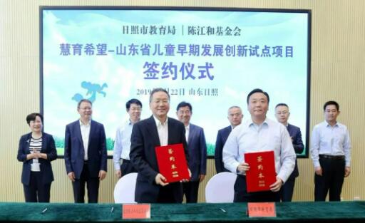 2019年5月22日,《慧育希望—山東省兒童早期發(fā)展創(chuàng)新試點(diǎn)項(xiàng)目合作備忘錄》簽字儀式在日照市舉行。北京陳江和公益基金會(huì)捐資1000萬(wàn)人民幣,用于探索農(nóng)村貧困地區(qū)兒童早期發(fā)展干預(yù)的可行模式。日照市副市長(zhǎng)張培林、日照市教育局負(fù)責(zé)人見(jiàn)證了簽約儀式。這是山東省首個(gè)兒童早期發(fā)展創(chuàng)新試點(diǎn)項(xiàng)目。 2年間,北京陳江和公益基金會(huì)在日照市五蓮縣先后建成20個(gè)兒童早期發(fā)展活動(dòng)中心,已惠及該縣9個(gè)鄉(xiāng)鎮(zhèn)街道。