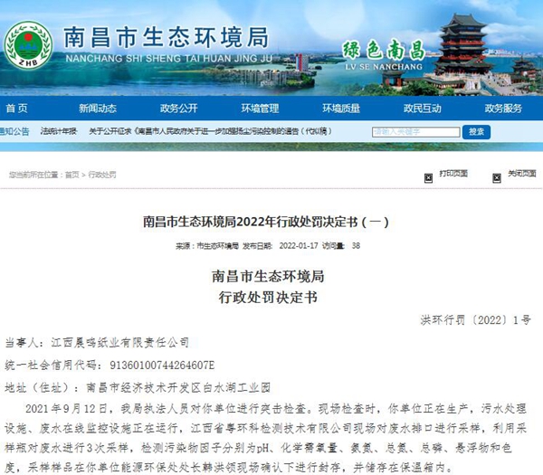 處罰決定書顯示,2021年9月12日,南昌市生態環境局執法人員對江西晨鳴紙業有限責任公司進行突擊檢查。有關工作人員現場對廢水排口進行3次采樣并封存。2021年9月23日,執法人員再次檢查,現場告知江西晨鳴紙業有限責任公司9月12日廢水檢測結果:pH值、化學需氧量、氨氮、總氮、總磷均達標,懸浮物,色度分別超標0.98倍、0.28倍。 執法人員向江西晨鳴紙業有限責任公司下達了《責令改正違法行為決定書》,責令其停止違法行為,并在60天內對廢水中超標的色度和懸浮物進行整改。 南昌市生態環境局于2021年11月4日召開環境行政處罰案件審理委員會會議,經集體審議,擬決定對江西晨鳴紙業有限責任公司作出罰款人民幣肆拾萬零壹仟元整的行政處罰。事后,江西晨鳴紙業有限責任公司提交《行政處罰聽證申請書》,12月22日在南昌市生態環境局會議室舉行聽證會。 2021年12月27日南昌市生態環境局再次召開案件審理委員會,經各委員審議,一致同意對江西晨鳴紙業有限責任公司超標排放水污染物的行為予以處罰。決定罰款人民幣肆拾萬零壹仟元整。