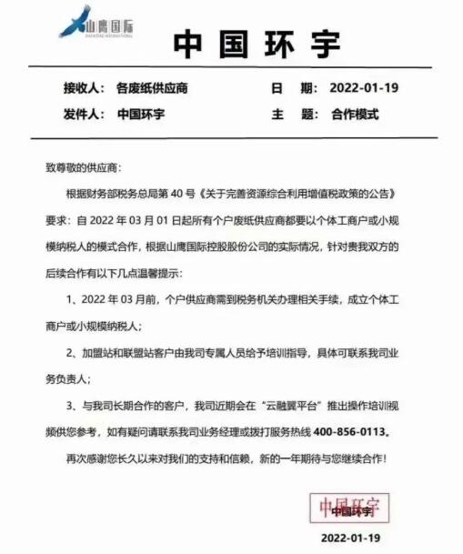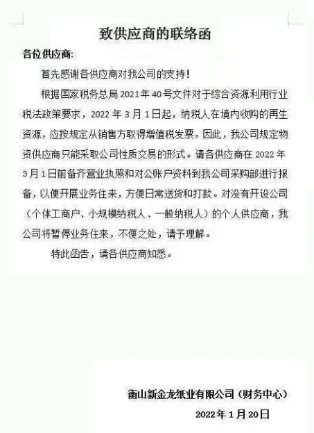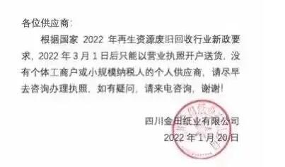 目前為止,山鷹國際、林平紙業(yè)、新金龍紙業(yè)、金田紙業(yè)等公司已明確表示3月1日后送貨需營業(yè)執(zhí)照開戶,均以個(gè)體工商戶和小規(guī)模納稅人的模式合作。
