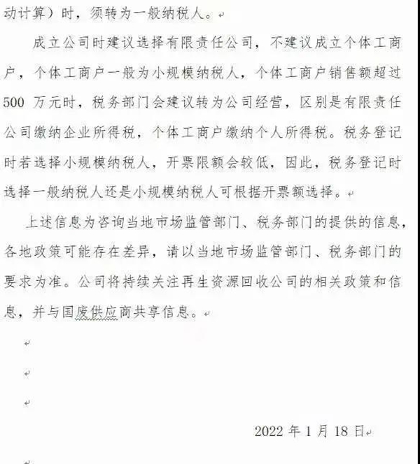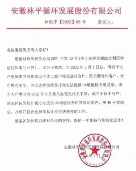 根據(jù)財(cái)務(wù)部稅務(wù)總局第40號《關(guān)于完善資源綜合利用增值稅政策的公告》要求:自2022年03月01日起所有個(gè)戶廢紙供應(yīng)商都要以個(gè)體工商戶或小規(guī)模納稅人的模式合作。