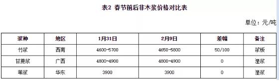 【導語】春節(jié)假期結(jié)束后在國際消息面支撐下,紙漿期貨主力合約走高,帶動進口木漿部分現(xiàn)貨報盤跟漲250-350元/噸,非木漿市場在經(jīng)過春節(jié)假期短暫停歇后,部分產(chǎn)品價格跟漲。 春節(jié)假期期間竹漿、甘蔗漿以及草漿部分企業(yè)停機放假,市場交投基本停滯,節(jié)后隨著部分產(chǎn)線復工,非木漿開工小幅提升。但下游部分紙廠仍處于放假模式,需求跟進不足,實單放量有限。而進口木漿市場受到紙漿期貨帶動,報盤較節(jié)前上行,支撐非木漿市場心態(tài)。
