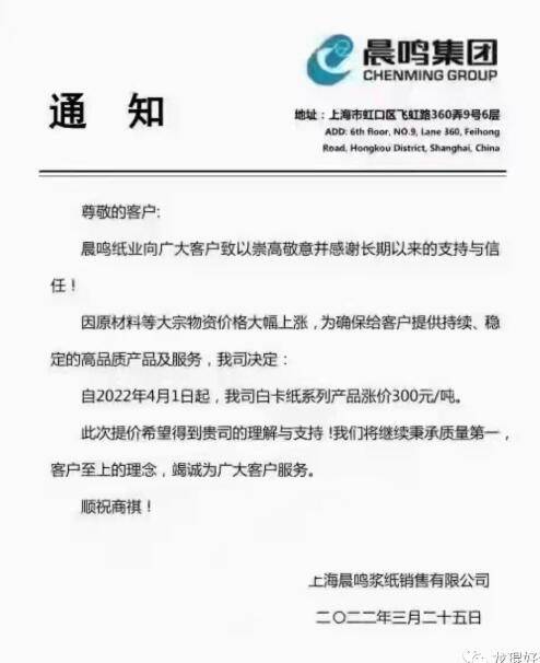 晨鳴紙業 4月1日起,白卡紙系列產品漲價300元/噸。