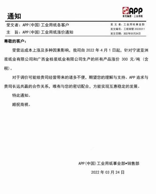 白卡紙大廠齊漲300元/噸 就在瓦楞紙、牛卡紙等紙種相繼提漲的同時,白卡紙漲價函也紛至沓來。APP金光紙業、晨鳴紙業、博匯紙業等主要白卡紙生產企業,幾乎同時宣布將在近期上漲300元/噸,生效時間均將從4月1日起。 APP金光紙業 4月1日起,針對寧波亞洲漿紙和廣西金桂漿紙業生產的所有產品漲價300元/噸。