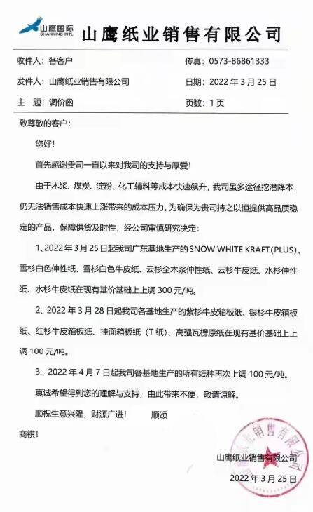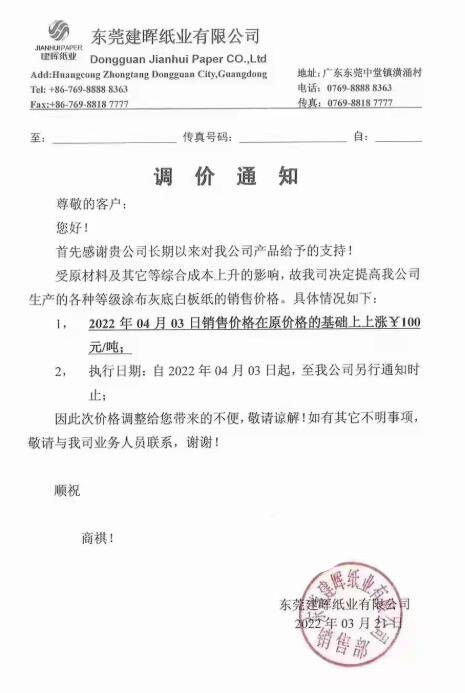 博匯紙業 4月1日日,所有卡紙類產品在目前售價基礎上上漲300元/噸。