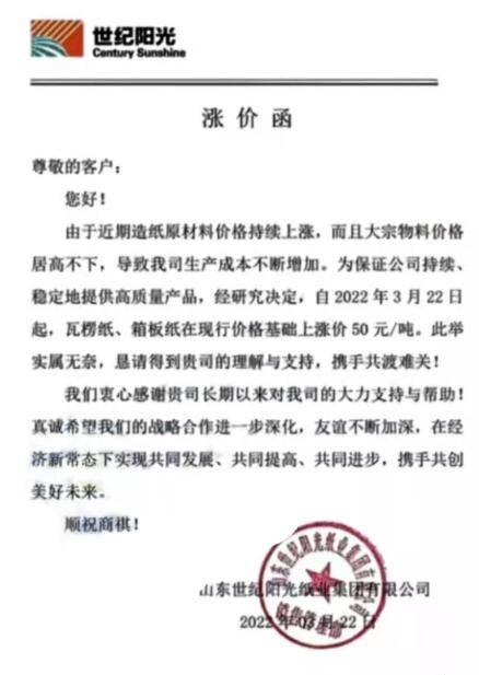 除了玖龍、山鷹之外,其余紙廠也不甘弱后,相繼宣布在本月底或下月初漲價。其中,山東世紀陽光在3月22日就對瓦楞紙、箱板紙上調50元/噸;江門明星紙業、新鄉市亨利環保于3月28日開始漲價50元/噸;東莞建暉紙業的灰底白板紙從4月3日起上漲100元/噸。 山東世紀陽光紙業: