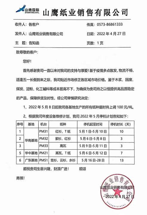 5月2日,浙江榮晟環保紙業股份有限公司發函稱,受疫情影響,原輔材料價格居高不下,公司經營深受重壓,為保障高品質的產品和供貨的及時性,故決定自5月8日起所有產品上調100元/噸,旗下五大紙機將在近期各自停機6-10天。