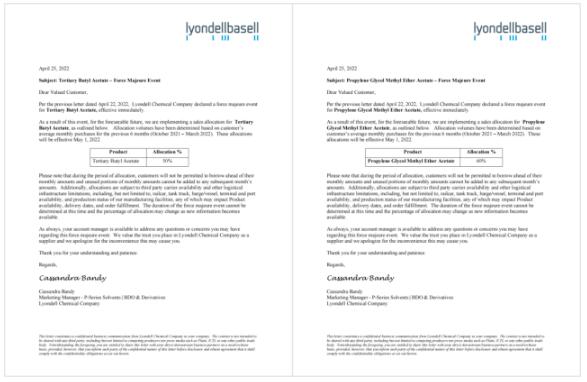 01、多家化工巨頭停供 實際上,今年在全球能源危機影響下,已有多家國際化工企業宣布停供。 4月27日,美國能源巨頭埃克森美孚表示,其俄羅斯子公司Exxon Neftegas已宣布其“薩哈林1號”油氣項目的運營受到不可抗力影響,原因是對俄羅斯的制裁使得向客戶運送原油變得越來越困難。 “薩哈林1號”項目在俄羅斯遠東的庫頁島海岸生產Sokol原油,每天出口約27.3萬桶,主要出口到韓國,以及日本、澳大利亞、泰國和美國等其他目的地。 在俄烏沖突爆發后,埃克森美孚在3月1日宣布,將退出約40億美元的資產,并停止所有在俄羅斯的業務,包括“薩哈林1號”。 4月底,英力士5大工廠宣布交付遭受不可抗力。英力士在致客戶的一封信函中表示,該企業所有與鐵路限制相關的聚烯烴產品都受到不可抗力影響,預計將被要求將鐵路運輸限制在其最佳平均日費率以下。 此次不可抗力的聚烯烴產品包括: 德克薩斯州 Cedar Bayou 工廠的31.8 萬噸/年高密度聚乙烯 (HDPE)裝置; 德克薩斯州 Chocolate Bayou 工廠的43.9 萬噸/年聚丙烯 (PP)裝置; 德克薩斯州 Deer Park 的工廠的79.4 萬噸/年的高密度聚乙烯 (HDPE)裝置; 德克薩斯州 Deer Park 工廠的14.7 萬噸/年聚丙烯 (PP)裝置; 加利福尼亞州卡森的23 萬噸/年聚苯乙烯(PS)裝置。 此外,Ineos Olefins & Polymers本月早些時候因停電和制造位于加利福尼亞州卡森的 PP 工廠尚未恢復運營。 值得注意的是,4月以來,化工巨頭利安德巴賽爾因機械故障等不可抗力因素,也多次發布公告,醋酸原料、醋酸叔丁酯、乙二醇乙醚醋酸酯(EBA,DBA)等產品供應出現短缺。 4月15日,利安德巴賽爾位于德克薩斯州拉波特(La Porte)的醋酸原料一氧化碳供應系統發生了機械故障。 4月22日,宣布醋酸叔丁酯、乙二醇乙醚醋酸酯(EBA,DBA)等產品遭受不可抗力影響。