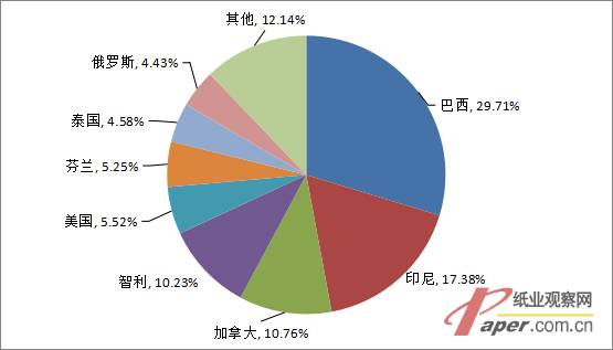 1-3月,針葉漿進(jìn)口量177.44萬(wàn)噸,同比下降19.14%;闊葉漿進(jìn)口量344.72萬(wàn)噸,同比下降4.81%;本色漿進(jìn)口量40.44萬(wàn)噸,同比增長(zhǎng)63.48%;化學(xué)漿進(jìn)口量86.11萬(wàn)噸,同比下降13.58%;化機(jī)漿進(jìn)口量31.09萬(wàn)噸,同比下降32.88%;廢紙漿進(jìn)口量73.97萬(wàn)噸,同比增長(zhǎng)53.64%。 巴西為最大紙漿進(jìn)口國(guó) 占比近三成 2022年1-3月進(jìn)口紙漿各國(guó)占比情況