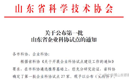 4月26日,山東省科學技術協會發布了《關于公布第一批山東省企業科協試點的通知》,確定了第一批企業科協試點單位共27家,亞太森博(山東)漿紙有限公司科協成功入選該名單。