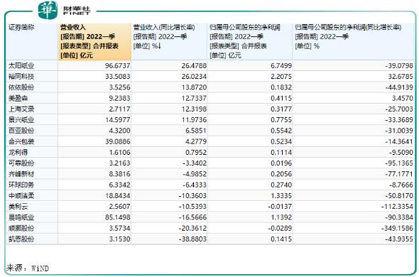 無(wú)論是生活用紙還是包裝用紙等,各類紙類用品已經(jīng)成為現(xiàn)代人的大宗消耗品,尤其是在海外,生活用紙的消費(fèi)量更是讓人瞠目結(jié)舌。這也引發(fā)了新冠疫情之下,海外屢屢出現(xiàn)搶購(gòu)衛(wèi)生紙的事件。 剛需品、及大宗消耗品等多重屬性,是否意味著造紙行業(yè)是門好生意,行業(yè)企業(yè)已經(jīng)賺得盆滿缽滿? 筆者拉出2022年一季度造紙行業(yè)數(shù)據(jù),與大家共同分享。 掙扎在虧損邊緣 WiND 17家造紙指數(shù)成份股今年一季度業(yè)績(jī)比較難看。 行業(yè)營(yíng)收規(guī)模較大的太陽(yáng)紙業(yè)實(shí)現(xiàn)營(yíng)收規(guī)模約96.67億元,同比增長(zhǎng)約26.48%。同期公司歸母凈利潤(rùn)實(shí)現(xiàn)約6.75億元,卻同比減少近40%; 相同的境遇的行業(yè)公司還有依依股份、上海艾錄、景興紙業(yè)、百亞股份、龍利得、可靠股份等。