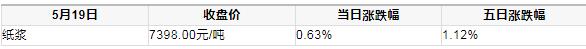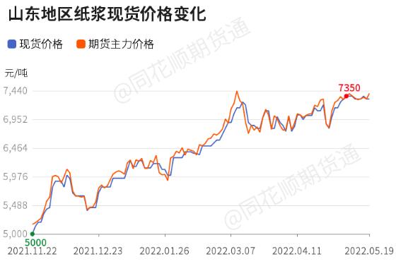 5月19日山東地區(qū)紙漿現(xiàn)貨價格報價7300.00元/噸,相較于期貨主力價格(7398.00元/噸)貼水98.00元/噸。