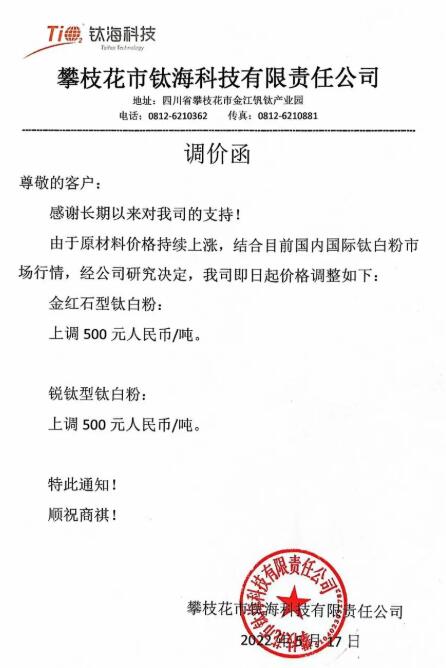 同期,攀枝花市鈦海科技發布調價函,稱即日起金紅石型鈦白粉、銳鈦型鈦白粉上調500元/噸。