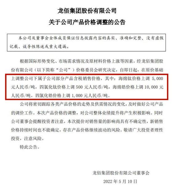 亞洲最大的鈦白粉商龍佰集團也在3天內兩次發函,宣布品氯化法鈦白粉在原價基礎上上調700元/噸,R-996、LR-108、LR-972型號硫酸法鈦白粉在原價基礎上上調500元/噸。海綿鈦價格上調5000元/噸,四氯化鈦價格上調500元/噸,海綿鋯價格上調1萬元/噸,四氯化鋯價格上調1000元/噸。