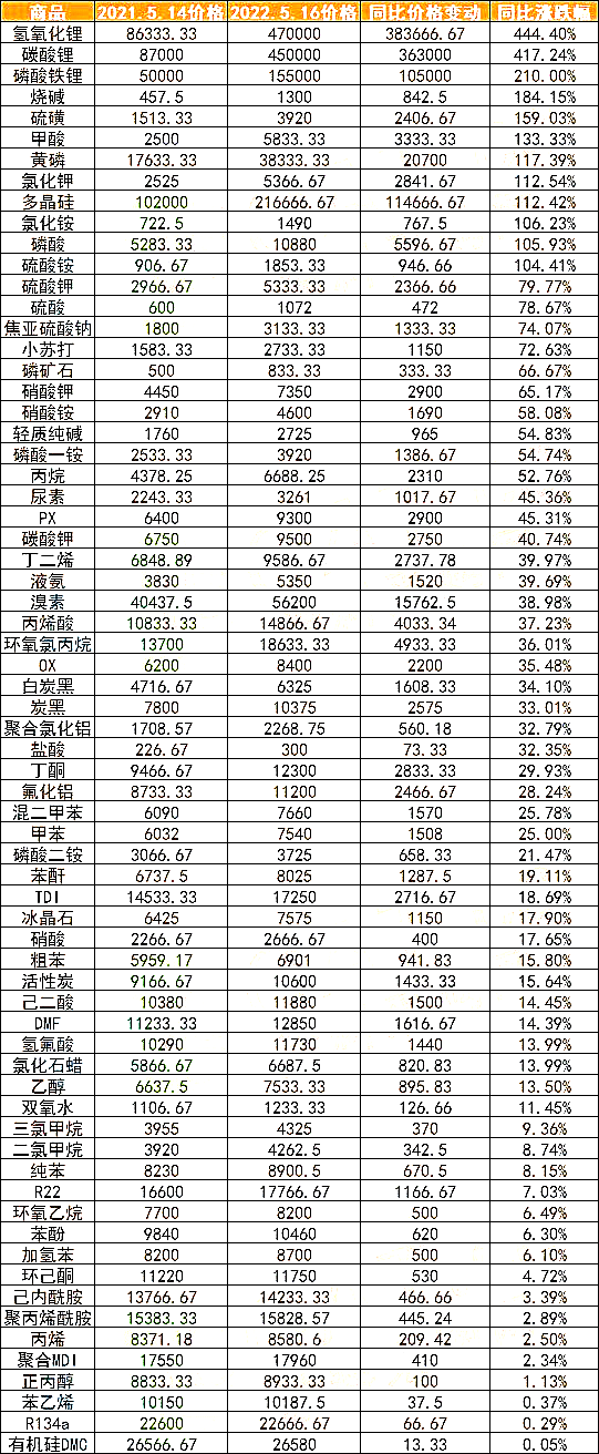 幾大鈦白粉龍頭同步調漲,讓人不禁揣測,是否即將掀起新的一輪行業調漲的浪潮,給火爆了20余個月的鈦白粉再添一把火。但也有人表示,此前3月的鈦白粉龍頭漲價也沒能引起行業跟漲,會不會化工市場價格已經見頂,在供需兩弱的當下已經無力飆高了呢?還有人表示,化工市場的上漲不是一日之功,下跌也無法一蹴而就,現在的微調根本不足以抵消近幾年來持續上漲的態勢。那么真實的情況究竟是怎樣的呢? 同比上漲444.4%,50余種化工品同比飆高 要想探究目前化工品的價格在跌宕起伏的市場行情中究竟是漲是跌,就要看看去年同期這些化工品的價格,對于行情走勢就能一清二楚了。目前50余種化工原材料價格較去年同期有所上漲,其中氫氧化鋰噸價上調超過38萬,碳酸鋰、多晶硅、磷酸鐵鋰噸價上漲超過10萬,黃磷、溴素噸價上調在1萬元以上,且部分化工原料同比漲幅屢屢翻倍,最高上漲超過400%。 氫氧化鋰目前報價470000元/噸,較去年同期價格上漲383666.67元/噸,漲幅444.40%; 碳酸鋰目前報價450000元/噸,較去年同期價格上漲363000元/噸,漲幅417.24%; 磷酸鐵鋰目前報價155000元/噸,較去年同期價格上漲105000元/噸,漲幅210.00%; 燒堿目前報價1300元/噸,較去年同期價格上漲842.5元/噸,漲幅184.15%; 硫磺目前報價3920元/噸,較去年同期價格上漲2406.67元/噸,漲幅159.03%; 甲酸目前報價5833.33元/噸,較去年同期價格上漲3333.33元/噸,漲幅133.33%; 黃磷目前報價38333.33元/噸,較去年同期價格上漲20700元/噸,漲幅117.39%; 氯化鉀目前報價5366.67元/噸,較去年同期價格上漲2841.67元/噸,漲幅112.54%; 多晶硅目前報價216666.67元/噸,較去年同期價格上漲114666.67元/噸,漲幅112.42%; 氯化銨目前報價1490元/噸,較去年同期價格上漲767.5元/噸,漲幅106.23%; 硫酸銨目前報價1853.33元/噸,較去年同期價格上漲946.66元/噸,漲幅104.41%; 硫酸鉀目前報價5333.33元/噸,較去年同期價格上漲2366.66元/噸,漲幅79.77%; 硫酸目前報價1072元/噸,較去年同期價格上漲472元/噸,漲幅78.67%; 焦亞硫酸鈉目前報價3133.33元/噸,較去年同期價格上漲1333.33元/噸,漲幅74.07%; 小蘇打目前報價2733.33元/噸,較去年同期價格上漲1150元/噸,漲幅72.63%; 磷礦石目前報價833.33元/噸,較去年同期價格上漲333.33元/噸,漲幅66.67%; 硝酸鉀目前報價7350元/噸,較去年同期價格上漲2900元/噸,漲幅65.17%; 硝酸銨目前報價4600元/噸,較去年同期價格上漲1690元/噸,漲幅58.08%; 輕質純堿目前報價2725元/噸,較去年同期價格上漲965元/噸,漲幅54.83%; 磷酸一銨目前報價3920元/噸,較去年同期價格上漲1386.67元/噸,漲幅54.74%; 丙烷目前報價6688.25元/噸,較去年同期價格上漲2310元/噸,漲幅52.76%。 部分化工品目前價格與去年同期價格對比