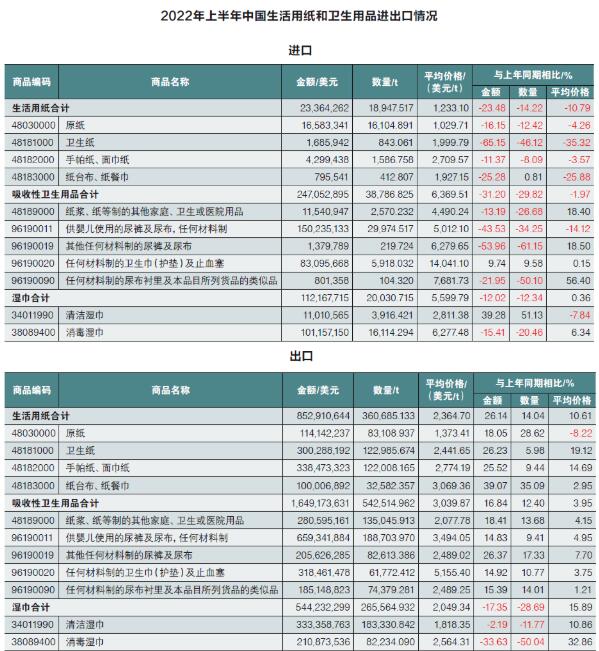生活用紙 進(jìn)口 與2021年大幅增長的形勢相反,2022年上半年生活用紙進(jìn)口量和進(jìn)口額都出現(xiàn)雙位數(shù)下降,進(jìn)口量1.89萬t,不足2萬t,仍以原紙為主,占總進(jìn)口量的85.0%。 出口 2022年上半年生活用紙出口形勢良好,一改2021年下半年以來下降的趨勢,出口量、出口額、出口平均價格都實現(xiàn)了雙位數(shù)的增長。出口產(chǎn)品仍以加工成品為主,占比77%。原紙和加工成品的出口量和出口額全部實現(xiàn)增長,且加工成品的出口平均價格也出現(xiàn)增長,出口產(chǎn)品的結(jié)構(gòu)繼續(xù)向高端化發(fā)展。 在經(jīng)歷了2020年上半年大幅上漲和2021年上半年顯著回落的波動后,2022年上半年生活用紙出口量基本恢復(fù)常態(tài),略高于2019年上半年的水平。 吸收性衛(wèi)生用品 進(jìn)口 2022年上半年,吸收性衛(wèi)生用品進(jìn)口量3.9萬t,比2021年同期下降29.82%,其中占比最大的嬰兒紙尿褲下降更多,達(dá)到34.25%;成人紙尿褲進(jìn)口數(shù)量最小,只有219.7t,但同比下降61.15%,下降幅度最大;在吸收性衛(wèi)生用品中,衛(wèi)生巾(護(hù)墊)及止血塞是唯一實現(xiàn)增長的品類,進(jìn)口量和進(jìn)口額分別增長9.58%和9.74%。 進(jìn)口量的下降,顯示國產(chǎn)吸收性衛(wèi)生用品已經(jīng)能夠滿足國內(nèi)市場需求。同時,數(shù)據(jù)顯示,成人失禁用品(海關(guān)編碼48189000,96190019和96190090)進(jìn)口平均價格出現(xiàn)較大增長,說明進(jìn)口的少量產(chǎn)品主要是高端產(chǎn)品的補充。 出口 2022年上半年,吸收性衛(wèi)生用品出口仍然保持全面增長勢頭,出口量、出口額和出口平均價格都延續(xù)了2021年同期的增長趨勢,分別增長12.40%、16.84%和3.95%。其中,嬰兒紙尿褲仍是占比最大的品類,約占34.8%,與2021年同期基本相當(dāng)。 濕巾 進(jìn)口 海關(guān)統(tǒng)計的濕巾分為清潔濕巾和消毒濕巾兩大類,我國的濕巾進(jìn)出口貿(mào)易以出口為主,進(jìn)口量不足出口量的1/10。 2022年上半年,濕巾總進(jìn)口量和總進(jìn)口額與2021年同期相比都出現(xiàn)兩位數(shù)下降,其中占比80%以上的消毒濕巾進(jìn)口量和進(jìn)口額分別下降20.46%和15.41%。 出口 與2021年同期相比,濕巾的出口量和出口額分別下降28.69%和17.35%,清潔濕巾和消毒濕巾也都呈現(xiàn)下降的趨勢。但出口平均價格都出現(xiàn)兩位數(shù)上漲,說明國產(chǎn)的濕巾產(chǎn)品在國際市場上有一定的話語權(quán)。出口產(chǎn)品以清潔濕巾為主,占比達(dá)到69%。