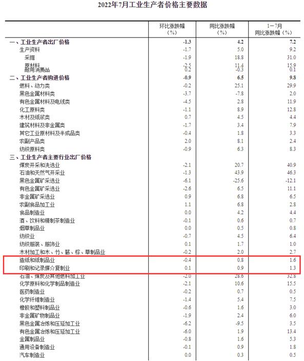 值得關注的是,造紙和紙制品業工業生產者出廠價格同比增長0.8%;印刷和記錄媒介復制業工業生產者出廠價格同比增長0.9%。