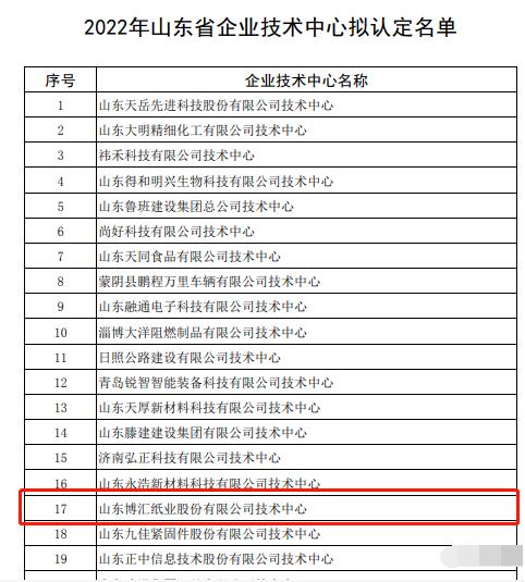 為深入貫徹落實省委、省政府創新型省份建設的決策部署,根據《山東省企業技術中心認定管理辦法(2021年修訂)》(魯發改高技〔2021〕428號),山東省發展和改革委員會于2022年6月份組織開展了2022年山東省企業技術中心認定工作。近日,山東省發展和改革委員會公布了2022年山東省認定企業技術中心名單,山東博匯紙業股份有限公司成功入選。