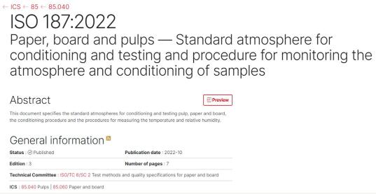 2022年10月18日,由中國造紙院牽頭制訂的ISO 187: 2022 Paper, board and pulps — Standard atmosphere for conditioning and testing and procedure for monitoring the atmosphere and conditioning of samples《紙、紙板和紙漿—試樣處理和試驗的標準大氣條件及其監控程序》國際標準正式發布,該標準是我國主導完成的第一項造紙領域國際標準,也是我國專家首次擔任造紙領域ISO工作組召集人所管理的標準項目。
