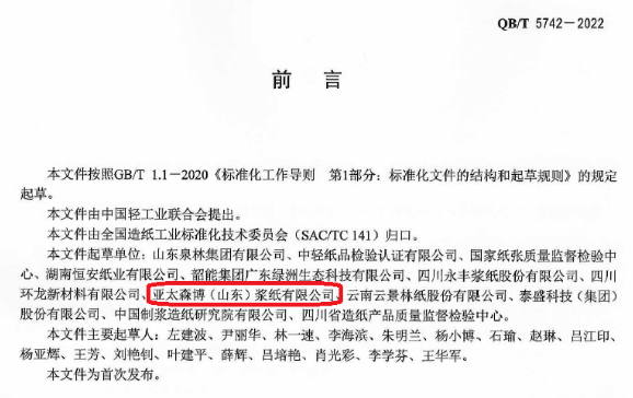 公司高度重視標準化工作,積極參加國家、行業、地方標準的制修訂工作。近年來,公司先后主導起草了QB/T 1678-2017《漂白硫酸鹽木漿》行業標準、QB/T 5568-2021《造紙工業能源檢測與評價方法 蒸煮系統》行業標準、QB/T 5569-2021《造紙工業能源檢測與評價方法 漂白系統》行業標準;參與起草了GB/T 10335.3-2018《涂布紙和紙板 涂布白卡紙》國家標準、QB/T 1022-2021《制漿造紙企業綜合能耗計算細則》行業標準、DB37/T 4065.1-2020《自制木漿造紙綠色工廠評價規范 第1部分:自制木漿造紙》地方標準。公司充分發揮標準的規范、引領、提升作用,以標準化助推企業的轉型升級與高質量發展。