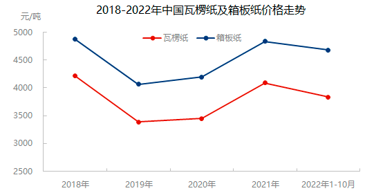 從市場(chǎng)運(yùn)行情況看,中國(guó)瓦楞及箱板紙價(jià)格跌宕起伏。其中市場(chǎng)供需、行業(yè)政策、成本因素突發(fā)事件等是推動(dòng)價(jià)格波動(dòng)的主要影響因素。2017-2018年上半年伴隨行業(yè)“禁廢令”及對(duì)美加征關(guān)稅等政策的實(shí)施,上游原料廢紙價(jià)格大幅上漲,成本及利潤(rùn)驅(qū)動(dòng)之下,瓦楞及箱板紙產(chǎn)品市場(chǎng)活躍,價(jià)格屢創(chuàng)新高;2018年三季度至2019年上半年,受全球經(jīng)濟(jì)增速放緩,對(duì)外貿(mào)易爭(zhēng)端等宏觀因素影響,下游需求轉(zhuǎn)淡,成本面廢紙價(jià)格同步持續(xù)走低影響,中國(guó)瓦楞及箱板紙產(chǎn)品市場(chǎng)重心大幅下挫;2019年下半年開始,瓦楞及箱板紙產(chǎn)品圍繞成本及供需面運(yùn)行,價(jià)格小幅修正向上運(yùn)行;2020年市場(chǎng)先抑后揚(yáng),5月瓦楞紙市場(chǎng)恐慌性下跌至2954元/噸,箱板紙下跌至3660元/噸,之后伴隨中國(guó)市場(chǎng)率先復(fù)蘇,各行業(yè)積極復(fù)工復(fù)產(chǎn),需求支撐強(qiáng)勁,瓦楞及箱板紙開啟上漲通道,至12月份瓦楞紙價(jià)格上漲至3617元/噸,箱板紙上漲至4569元/噸。2021年中國(guó)瓦楞及箱板紙產(chǎn)品市場(chǎng)價(jià)格均出現(xiàn)大幅上漲,主因2021年開始廢紙系市場(chǎng)正式進(jìn)入“無(wú)外廢”時(shí)代,原料廢紙供應(yīng)偏緊張,成本支撐影響下瓦楞及箱板紙產(chǎn)品均高位運(yùn)行,同時(shí)公共衛(wèi)生事件、極端天氣等外部因素繼續(xù)擾動(dòng)市場(chǎng),紙企開工率低位,供應(yīng)量偏緊張。2022年國(guó)內(nèi)經(jīng)濟(jì)下行、海外出口訂單外移以及供應(yīng)端持續(xù)大幅增長(zhǎng)等因素影響下,瓦楞紙及箱板紙市場(chǎng)供需矛盾升級(jí),紙價(jià)持續(xù)下行為主。2021年1-10月份瓦楞紙產(chǎn)品均價(jià)為3836元/噸,箱板紙產(chǎn)品均價(jià)為4683元/噸,同比分別下滑3.96%和1.31%。