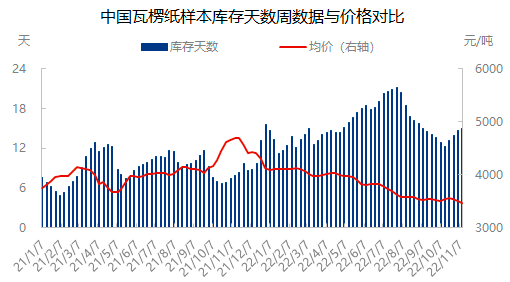 進(jìn)入11月份,瓦楞紙及箱板紙下游需求已臨近春節(jié)前的消費(fèi)旺季,2023年春節(jié)在1月份,故11-12月份為春節(jié)前需求最旺的階段。然11月初至今規(guī)模紙企已經(jīng)執(zhí)行1-2輪優(yōu)惠政策,從當(dāng)前紙企庫(kù)存情況來(lái)看,庫(kù)存水平較去年同期處于高位,且?guī)齑嫠揭廊槐3稚仙厔?shì),市場(chǎng)供需嚴(yán)重失衡。周內(nèi)華南市場(chǎng)需求有所改善,部分紙企出貨良好,然國(guó)內(nèi)其它地區(qū)出貨一般,尤其北方受公共衛(wèi)生事件影響抑制部分消費(fèi),紙企停機(jī)情況下紙價(jià)依然呈下滑走勢(shì)。預(yù)計(jì)春節(jié)前仍有出貨好轉(zhuǎn)的階段,然市場(chǎng)供需失衡的狀態(tài)下,紙價(jià)或維持弱穩(wěn)趨勢(shì),旺季紙價(jià)上漲已成為過(guò)去。