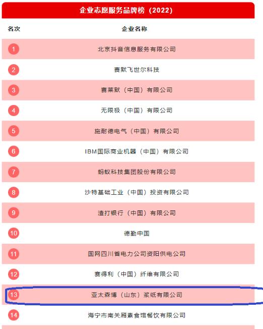 為更好地推動中國企業(yè)志愿服務(wù)的快速和健康發(fā)展,形成一個行業(yè)共識的評價指標,并以此標準為依據(jù)形成行業(yè)的評價基準,為企業(yè)志愿服務(wù)的發(fā)展水平賦值,進而判斷企業(yè)志愿服務(wù)的發(fā)展水平,和眾澤益與南方周末公益研究中心聯(lián)合推出中國企業(yè)志愿服務(wù)品牌榜單。11月17日,在由南方周末主辦的2022筑夢者公益大會上,中國企業(yè)志愿服務(wù)品牌榜單正式發(fā)布,亞太森博(山東)漿紙有限公司憑借在志愿服務(wù)領(lǐng)域的優(yōu)異表現(xiàn),榮登榜單!