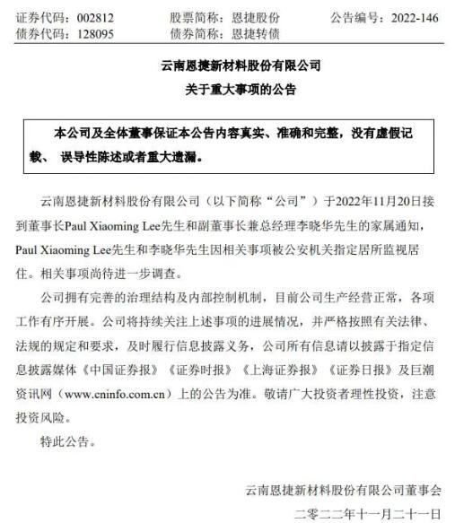 11月22日,恩捷股份開盤跌停,報價140.17元/股。 11月21日晚間,恩捷股份發布公告稱,公司于11月20日接到董事長Paul Xiaoming Lee(即李曉明)及副董事長兼總經理李曉華的家屬通知,二人因相關事項被公安機關指定居所監視居住,相關事項尚待進一步調查。 公告還稱,公司擁有完善的治理結構及內部控制機制,目前公司生產經營正常,各項工作有序開展。