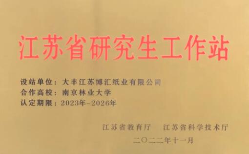 江蘇博匯紙業與南京林業大學聯合申報的“2022年江蘇省研究生工作站”,在公司相關部門積極準備材料、高校推薦及資格審核的基礎上,經省科技廳、省教育廳審核通過后,獲得了設站認定,并于2022年11月12日在鹽城市科技人才載體推介對接會上獲得了“江蘇省研究生工作站”授牌。