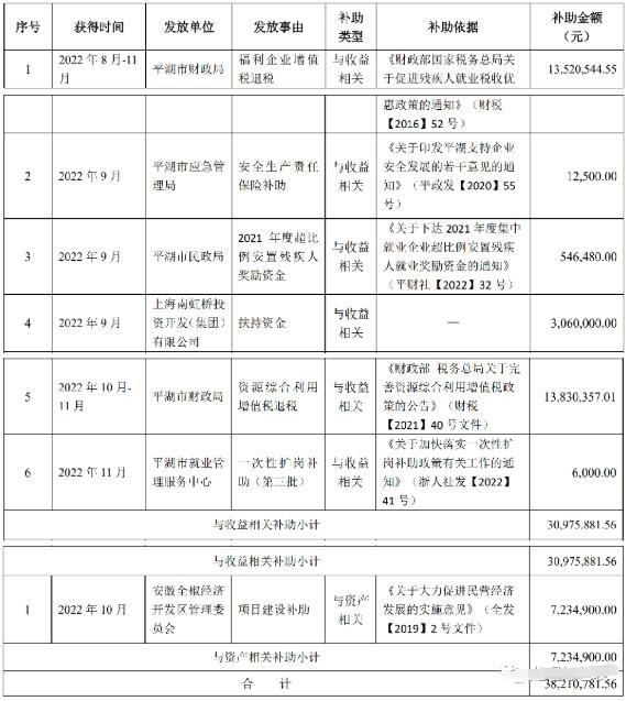 12月1日,浙江榮晟環(huán)保紙業(yè)股份有限公司(下文簡稱:榮晟環(huán)保)發(fā)布公告稱,自2022年8月24日至11月29日,公司及子公司累計收到政府補助38,210,781.56元(未經審計)。