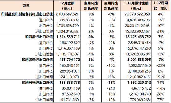 2022年1-12月國內(nèi)印刷器材出口12.16億美元(參見表7),與去年同期相比增長28%。其中,黑色印刷油墨出口2853.96噸、0.15億美元(同比增長25%);其他印刷油墨出口2.27萬噸、1.50億美元(同比增長31%);水性噴墨墨水出口2.77萬噸、2.43億美元(同比增長34%);PS膠印版材出口4237.34萬平方米、1.40億美元(同比增長24%);CTP膠印版材出口1.71億平方米、6.44億美元(同比增長29%);柔印版材出口53.08萬平方米、0.24億美元(同比下降1%)。 2022年1-12月國內(nèi)印刷器材進(jìn)出口貿(mào)易順差7.80億美元(同比增長77%)。 本期觀察 1-12月份國內(nèi)印刷品、印刷裝備、印刷器材三大類商品進(jìn)出口同比增長4%,較1-11月同比增速(5%)下降1個百分點,也是從8月份開始月度進(jìn)出口同比增長幅度連續(xù)第5個月收窄。 從進(jìn)出口商品市場看,2022年1-12月國內(nèi)印刷品、印刷裝備和印刷器材進(jìn)口和出口的變化特點如下: 亞洲和歐洲市場進(jìn)口大幅下降、其他市場進(jìn)口穩(wěn)定增長:1-12月份,國內(nèi)印刷產(chǎn)業(yè)三大類商品從亞洲進(jìn)口22.08億美元(同比下降23%)、歐洲進(jìn)口16.68億美元(同比下降13%)。同期,從北美洲進(jìn)口9.23億美元(同比增長3%)、拉丁美洲進(jìn)口0.56億美元(同比增長580%)、大洋洲進(jìn)口0.23億美元(同比增長15%)。 對全球各區(qū)域市場出口同步增長,亞洲市場是支撐出口增長的主力:1-12月份,國內(nèi)印刷產(chǎn)業(yè)三大類商品對全球各區(qū)域市場出口分布為,亞洲87.09億美元(同比增長14%)、北美洲47.35億美元(同比增長1%)、歐洲40.09億美元(同比增長6%)、大洋洲9.70億美元(同比增長15%)、拉丁美洲9.51億美元(同比增長29%)、非洲8.28億美元(同比增長22%)。 從進(jìn)出口商品類別看,2022年1-12月國內(nèi)印刷品、印刷裝備和印刷器材進(jìn)出口的變化特點如下: 三大類商品進(jìn)口負(fù)增長態(tài)勢延續(xù) ,但下降幅度變化各異:1-12月份,國內(nèi)印刷品進(jìn)口同比下降7%、印刷裝備進(jìn)口同比下降23%、印刷器材同比下降14%。與上期對比,印刷品同比下降幅度擴大3個百分點,印刷裝備同比下降幅度縮小2個百分點、印刷器材同比下降幅度擴大1個百分點。 印刷品、刷器材出口增長幅度趨緩、印刷裝備出口增長平穩(wěn):1-12月份,國內(nèi)印刷品、印刷裝備和印刷器材的出口同比增長速度分別為9%、8%和28%。與上期相比,印刷品出口增速回落1個百分點,印刷裝備出口增速穩(wěn)定、印刷器材出口增速回落7個百分點。 從進(jìn)出口商品品種看,2022年1-12月國內(nèi)印刷品、印刷裝備、印刷器材三大類商品進(jìn)口和出口增長較快的前五個品種如下: 進(jìn)口商品:凹版印刷機(+64%)、柔版印刷機(+38%)、票證類印刷品(+12%); 出口商品:膠印機(+37%)、柔版印刷機(+37%)、水性噴墨墨水(+34%)、其他印刷油墨(+31%)、CTP膠印版材(+29%)。 同期,上述三大類商品進(jìn)口和出口相對萎縮的前五個品種如下: 進(jìn)口商品:凸印機(-76%)、兒童圖畫書類印刷品(-71%)、CTP膠印版材(-68%)、其他出版物印刷品(-68%)、書刊裝訂設(shè)備(-52%); 出口商品:其他出版物印刷品(-78%)、票證類印刷品(-46%)、兒童圖畫書類印刷品(-5%)、期刊及雜志類印刷品(-4%)、絲網(wǎng)印刷機(-2%)。