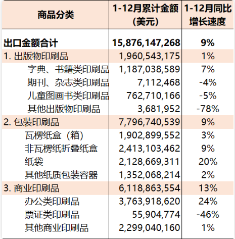 2022年1-12月國內(nèi)印刷品出口158.76億美元(參見表3),同比增長9%。其中,出版物印刷品出口19.61億美元(同比增長1%)、包裝印刷品出口77.97億美元(同比增長9%)、商業(yè)印刷品出口61.19億美元(同比增長13%)。 同期,相關(guān)印刷品主要出口品種:字典書籍類印刷品11.87億美元(同比增長7%)、兒童圖畫書類印刷品7.63億美元(同比下降5%)、瓦楞紙盒(箱)19.03億美元(同比增長3%)、非瓦楞紙折疊紙盒24.13億美元(同比增長9%)、紙袋21.29億美元(同比增長20%)、其他紙質(zhì)包裝容器13.52億美元(同比增長2%)、辦公類印刷品37.64億美元(同比增長24%)、其他商業(yè)印刷品22.99億美元(同比增長1%)。 表3 2022年1-12月國內(nèi)印刷品出口統(tǒng)計