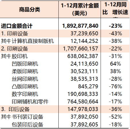 2022年1-12月國內(nèi)印刷品進(jìn)出口貿(mào)易順差133.27億美元(同比增長13%)。 印刷裝備 2022年1-12月國內(nèi)印刷裝備進(jìn)口18.93億美元(參見表4),與去年同期相比下降23%。其中,印前設(shè)備進(jìn)口0.37億美元(同比下降43%)、印刷設(shè)備進(jìn)口17.08億美元(同比下降22%)、印后設(shè)備進(jìn)口1.48億美元(同比下降36%)。 同期,相關(guān)設(shè)備主要進(jìn)口品種:計算機直接制版機158臺、0.12億美元(同比下降38%);膠印機1130臺、6.38億美元(同比下降31%);凹版印刷機51臺、0.24億美元(同比增長64%);柔版印刷機42臺、0.31億美元(同比增長38%);絲網(wǎng)印刷機313臺、0.39億美元(同比下降28%);數(shù)字印刷機21.01萬臺、1.91億美元(同比下降14%);印刷輔機和零件7.65億美元(同比下降17%);書刊裝訂設(shè)備2889臺、0.38億美元(同比下降52%);包裝印后設(shè)備130臺、0.38億美元(同比下降18%)。 表4 2022年1-12月國內(nèi)印刷裝備進(jìn)口統(tǒng)計