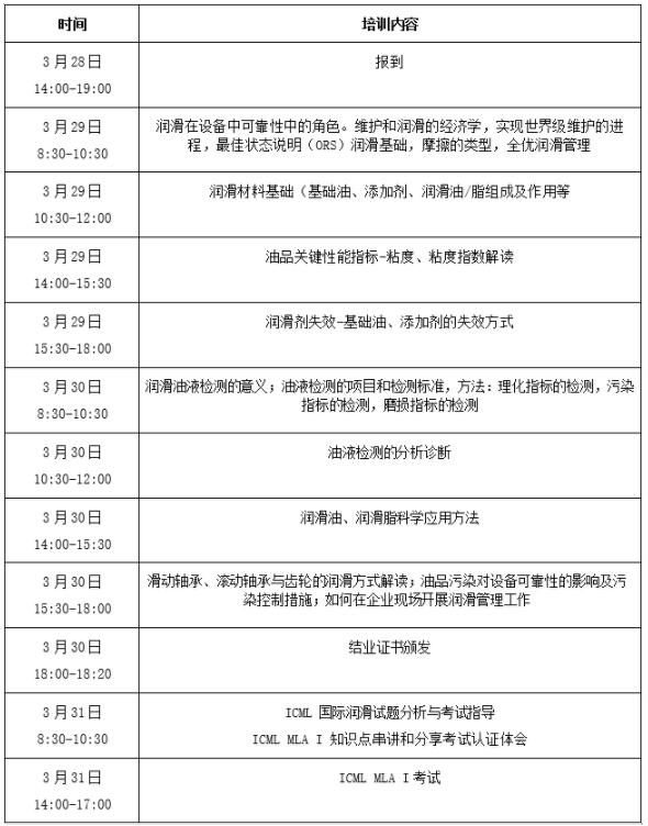 八、參加人員 1)企業(yè)設(shè)備部、、技術(shù)部、生產(chǎn)部、管理部等相關(guān)部門技術(shù)與管理人員; 2)設(shè)備售后工程師、診斷工程師、設(shè)備員等專業(yè)技術(shù)人員和操作人員; 3)設(shè)計(jì)院潤滑相關(guān)人員,油品采購部門和分析檢測部門專業(yè)技術(shù)人員; 4)從事潤滑油及潤滑設(shè)備銷售,潤滑油儀器的技術(shù)服務(wù)人員。 5)設(shè)備與零部件制造和經(jīng)銷商,如軸承,減速機(jī),燃機(jī),汽輪機(jī),壓力機(jī),壓縮機(jī),工程車,掘進(jìn)機(jī)等設(shè)計(jì),銷售以及技術(shù)人員。 九、費(fèi)用 全程認(rèn)證培訓(xùn)費(fèi)用合計(jì) 5600元/人/期。其中培訓(xùn)費(fèi) 4300 元,包括培訓(xùn)費(fèi)、餐費(fèi)、教材資料費(fèi)等,國際機(jī)器潤滑協(xié)會ICML MLA I考試認(rèn)證費(fèi)1300元。住宿統(tǒng)一安排,費(fèi)用自理。在培訓(xùn)之前結(jié)清培訓(xùn)以及需要考試的費(fèi)用。 ★ 培訓(xùn)教材1本,在培訓(xùn)現(xiàn)場,不僅對潤滑教材中的難點(diǎn)內(nèi)容具體講解,同時(shí)對學(xué)員在設(shè)備潤滑工作中遇到的實(shí)際問題進(jìn)行答疑解惑。 ★ 可以把工作中的設(shè)備潤滑問題提前整理,發(fā)郵件給我們。統(tǒng)一發(fā)到ght01@gti-oil.com匯總。 ★ 匯款信息 開戶名:廣研檢測(廣州)有限公司 開戶銀行:交通銀行廣州黃埔支行 賬號:441163506018800061916 十、報(bào)到,會務(wù)負(fù)責(zé)人聯(lián)系方式: 培訓(xùn)地點(diǎn):中國.長沙 報(bào)到酒店:另行通知 培訓(xùn)時(shí)間:2023年3月29-31日,28號報(bào)到 聯(lián)系方式: 高老師:13928739516 ght01@gti-oil.com 游老師:15820272721 youqiaoyan@gti-oil.com