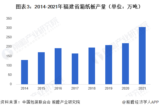 2021年福建省箱紙板產量為306.19萬噸 受益于上游造紙行業發展優勢,福建省在紙制品包裝領域處于全國領先地位。根據中國包裝聯合會數據統計,2014-2021年,福建省箱紙板產量總體呈現波動上升趨勢。2021年,福建省箱紙板產量達306.19萬噸,同比增長18.22%,為近年來新高。2021年福建省箱紙板產量占全國箱紙板總產量的18.22%,排名第一。
