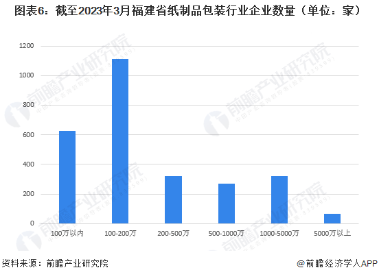 福建省紙制品包裝行業企業數量接近6000家 截至2023年3月,福建省紙制品包裝行業企業數量共有2722家,其中注冊資本為100-200萬之間的企業數量最高,達到1112家,占比超過40%。注冊資本在100萬之以內紙制品包裝企業數量為628家。注冊資本超過500萬的企業約占25%。