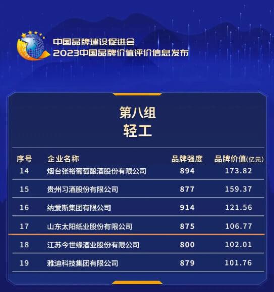 5月11日,2023世界品牌莫干山大會期間,中國品牌建設促進會聯合有關權威單位共同發布2023中國品牌價值評價信息。其中,山東太陽紙業股份有限公司品牌價值為106.77億元,品牌強度為875,位列輕工組第17位。