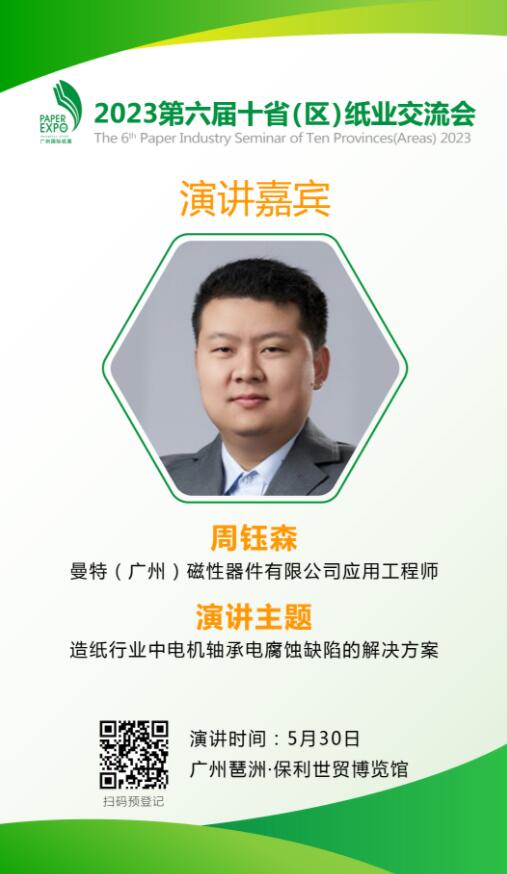 5月30日,2023第六屆十省(區(qū))紙業(yè)交流會,曼特(廣州)磁性器件有限公司應(yīng)用工程師周鈺森,將帶來《造紙行業(yè)中電機(jī)軸承電腐蝕缺陷的解決方案》主題演講,助力紙企技術(shù)升級,提高生產(chǎn)效率。