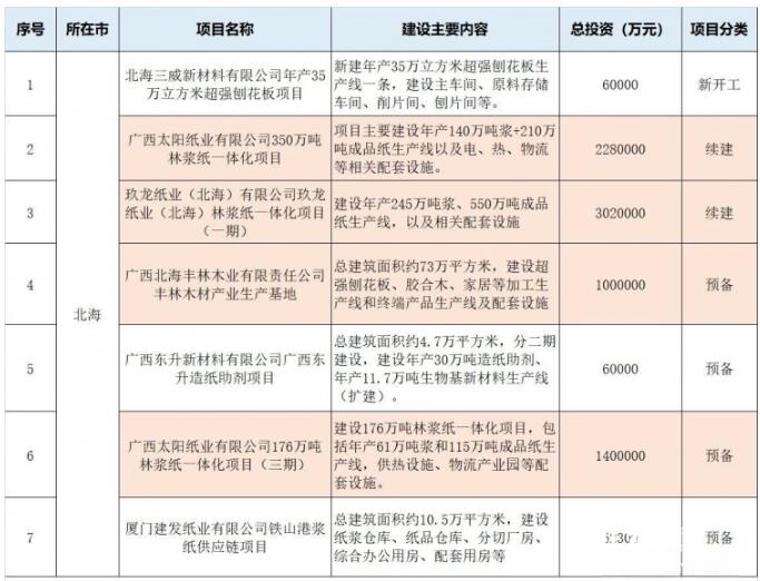 在入選的重點(diǎn)項(xiàng)目中,共有7個(gè)造紙項(xiàng)目入圍,總投資約1392億元,占全部投資的比重超過50%,主要分布在沿海的北海和欽州,梧州和來賓各有1個(gè)項(xiàng)目入選。